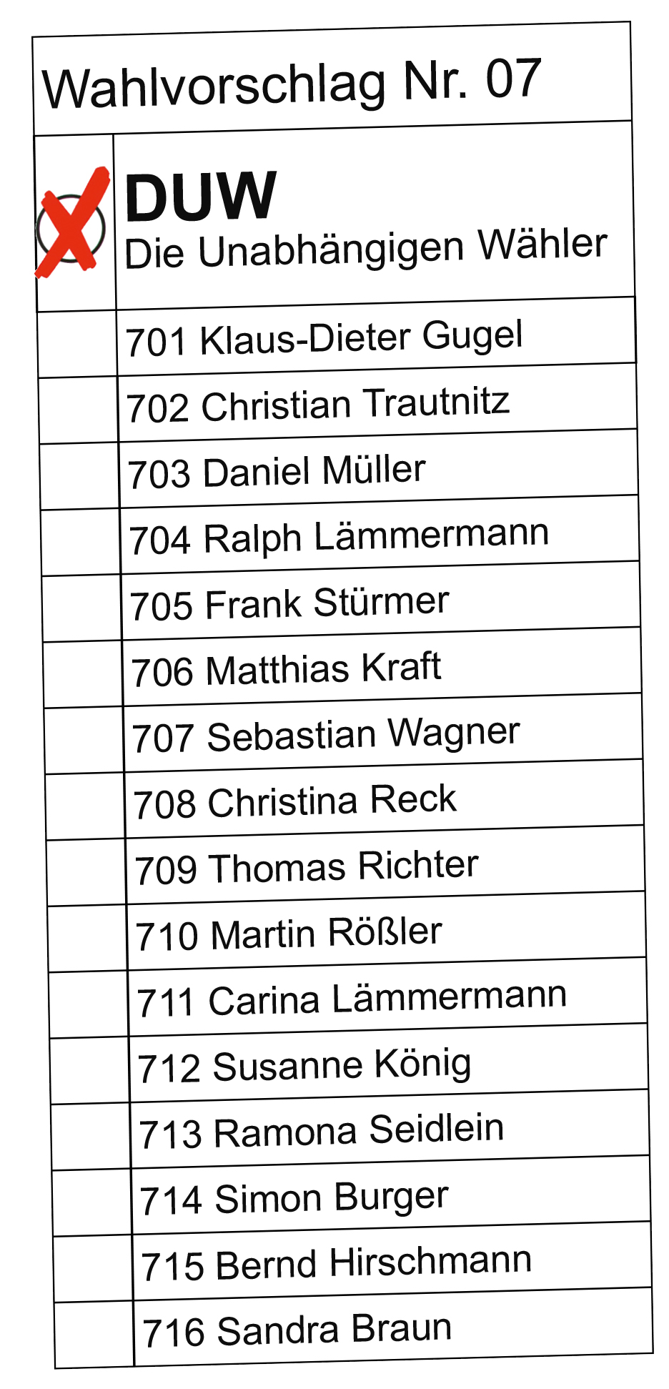 Wir die Kandidatinnen und Kandidaten der DUW sind davon überzeugt, dass unsere Liste die Bedürfnisse unserer Bürgerinnen und Bürger abdeckt und würden uns über Ihre Stimme freuen.